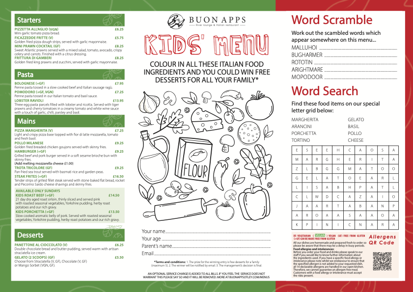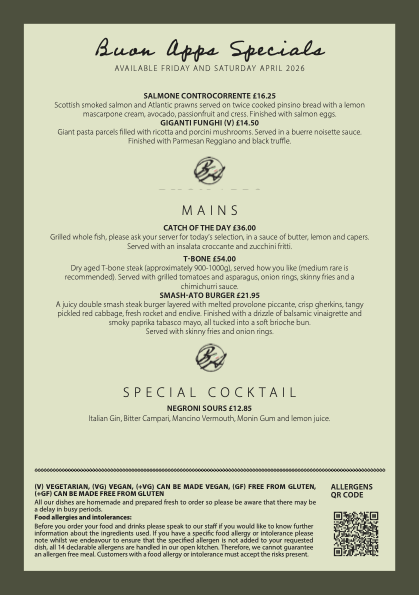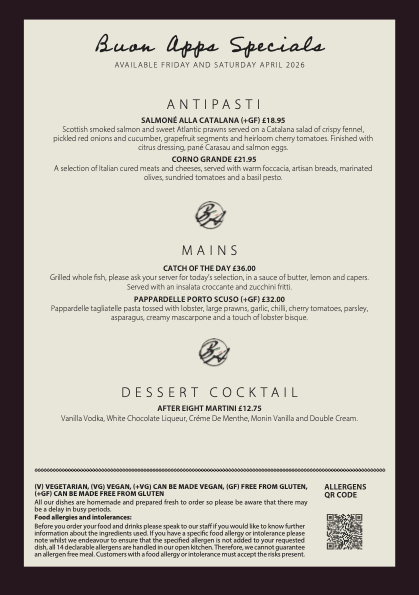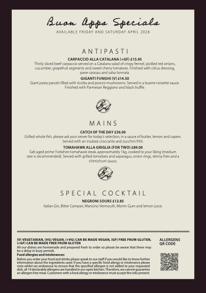 If you fancy great Italian food but can’t make it to Buon Apps, our Take-Away and Cook-at-Home options offer an easy alternative. (Take Away and Cook-At-Home dishes are for collection only.)